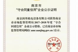 2020年2月26日,接到南京市企業信用管理協會通知,南京潤邦機電設備有限公司再次通過2017-2018年度市級“守合同重信用”企業的認定。誠信潤邦,傾心服務。